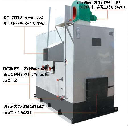 一、熱風蒸汽烘干爐主要特點: 1、采用回旋式加熱裝置制作,有燃燒室,熱能轉換室、蒸汽發生裝置、助燃裝置、風機、煙囪等部分組成。高效節能,熱能轉換率高。 2、燃燒所需燃料用木屑、碎木、煤炭等。 3、本設備在正常運轉時,燃料在燃燒室內充分燃燒,進入多級熱能轉換室,充分吸收后產生170°左右的溫度,在循環風機的作用下高溫氣流通過該設備的控制系統、輸送系統將高溫熱風輸送到烘干室內,對木材進行烘干處理。被干燥木材具有干燥周期短,成本低,干燥均勻,效果好,解決了木材干燥過程中出現的內裂、斷裂、表裂、變形、變色等缺陷。 4、設備配有熱能回收裝置,從而體現了熱能的充分利用,最大限度的降低了烘干成本,同時該設備在烘干過程中可將寄生在木材中的所有蛀蟲及蟲卵全部殺死。 5、可以按照要求設計成一爐配套兩間干燥室方便輪流作業。 6、可結合原有土窯進行技術改造,節省設備投資。 7、整體設備易操作,安全可靠。 8、本設備適合干燥各種木材,是各家具廠和木制品廠,土法干燥窯和舊式干燥設備的理想更新換代。 二、熱風(蒸汽)縱向循環木材烘干系統主要參數: